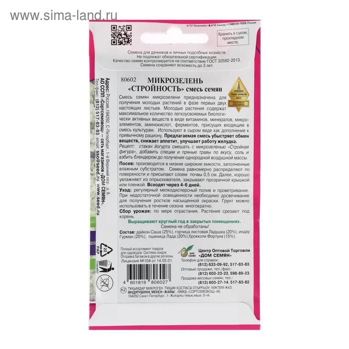 Состав: дайкон Саша (25%), горчица листовая Ладушка (20%), индау Гурман (20%), пшеница Лада (20%),брокколи Фортуна (15%)
