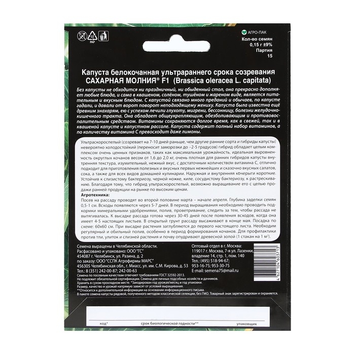 Семена Капуста белокочанная "Сахарная молния", F1, 0,15 г