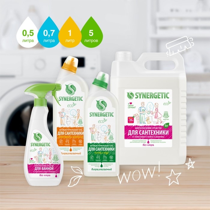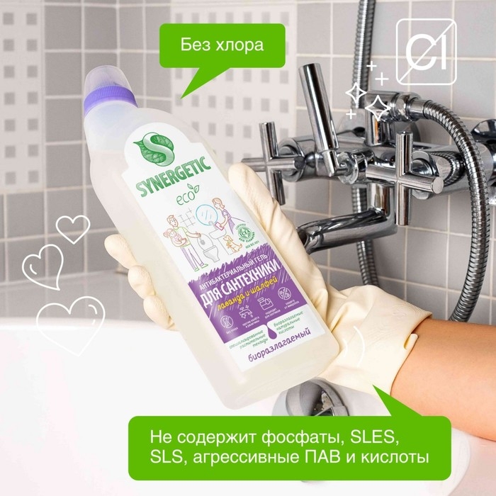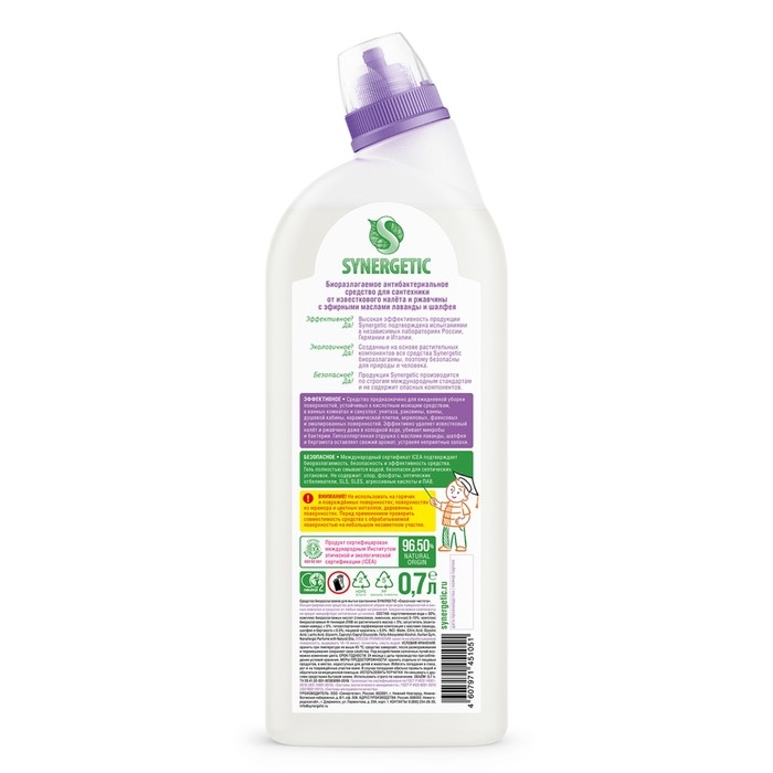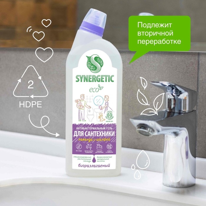 Биоразлагаемое антибактериальное средство для сантехники SYNERGETIC "Лаванда и шалфей" - концентрированное чистящее средство для ежедневной уборки поверхностей, устойчивых к кислотным моющим средствам, в ванных комнатах и санузлах: унитаза, раковины, ванны, душевой кабины, керамической плитки, акриловых, фаянсовых и эмалированных поверхностей.