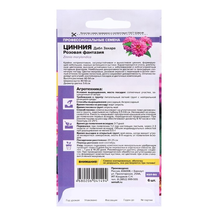 Супервыносливая, не требующая специального ухода сортосерия! Шикарная цинния с мощными побегами и множеством махровых соцветий. Кустики компактные, высотой 40-50 см, хорошо ветвятся. Цветки яркие, диаметром 5-6 см, с необычной окраской лепестков: насыщенно-розовой в центре, с переходом к более светлым краям. Отличительными признаками сортосерии являются: насыщенные и уникальные окраски цветков, длительный период цветения, повышенная толерантность к грибковым заболеваниям. Широко используется для оформления цветников, посадок в контейнеры и балконные ящики, для выращивания в вазонах и открытом грунте. Светолюбивое растение, отличается хорошей засухоустойчивостью. Предпочитает солнечные участки на рыхлых плодородных, хорошо дренированных почвах. Посевы на рассаду проводят в марте-апреле. Всходы появляются через 6-10 дней при температуре +21-23°С. Растения нормально развиваются при температуре +16-18°С. Высадка рассады в грунт в конце мая-июне, когда минует угроза заморозков. Посадочное расстояние – 25-30 см.