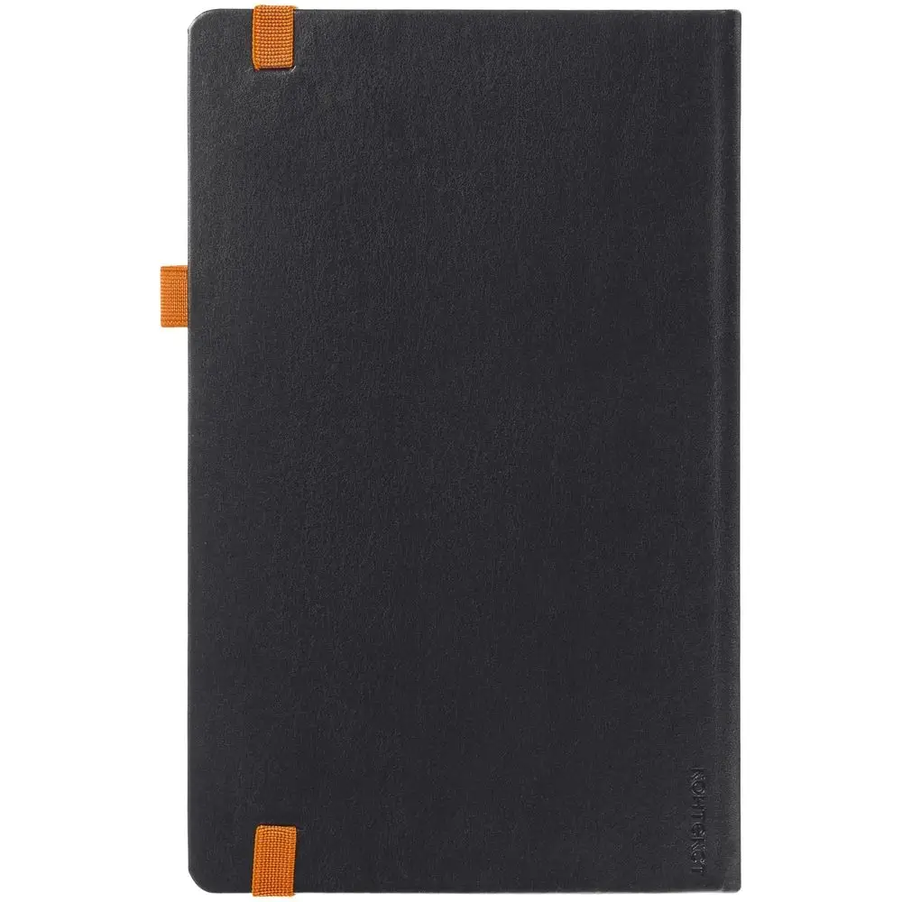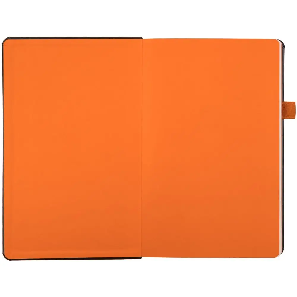 Ежедневник с твердой обложкой, выполнен из материала Waltz, черный АА, дополнен оранжевой резинкой и ляссе.