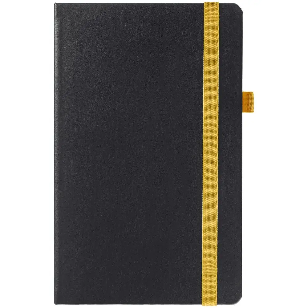 Ежедневник с твердой обложкой, выполнен из материала Waltz, черный АА, дополнен желтой резинкой и ляссе.