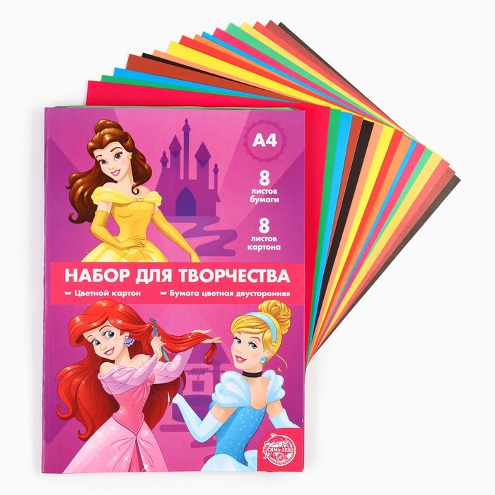 Набор «Принцессы» А4: 8 листов цветного одностороннего мелованного картона, 8 листов цветной двусторонней бумаги