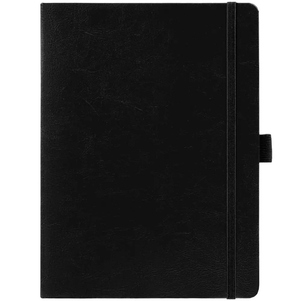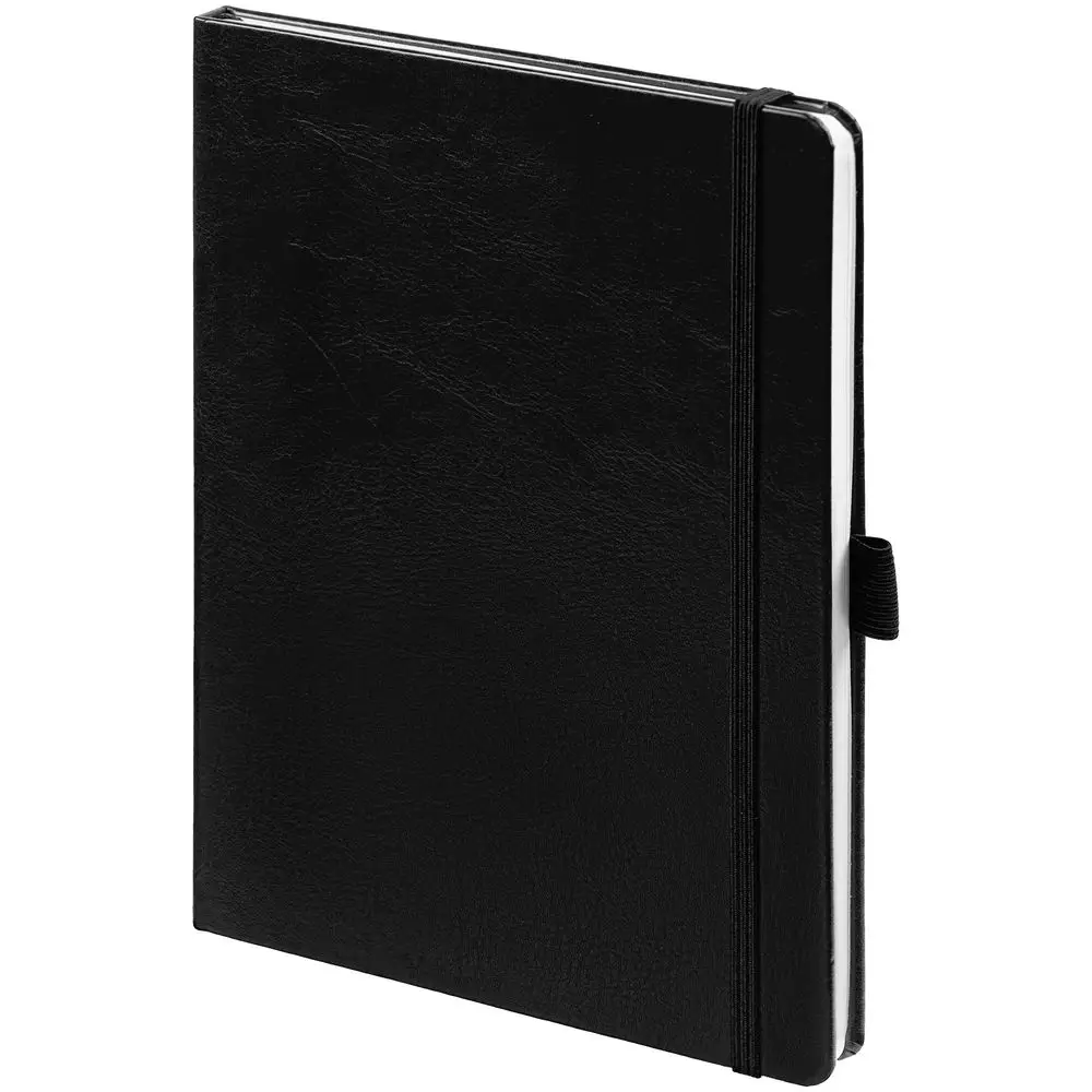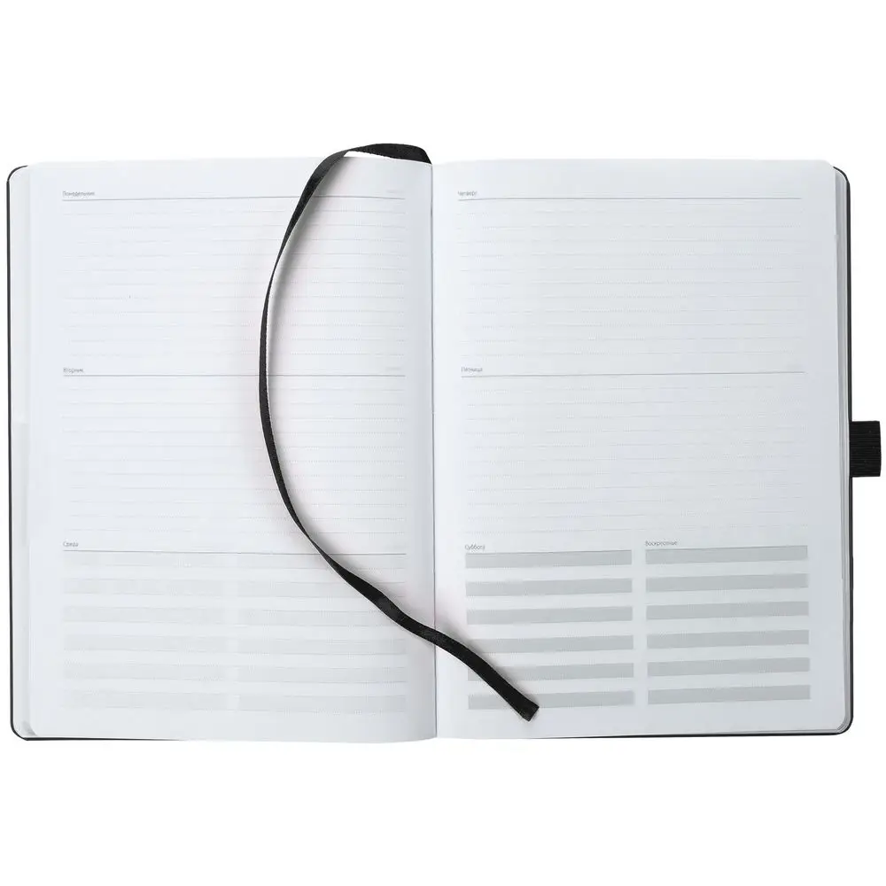 Еженедельник в твердой обложке выполнен из материала Nebraska, черный АА, дополнен резинкой, петлей для ручки и ляссе черного цвета.