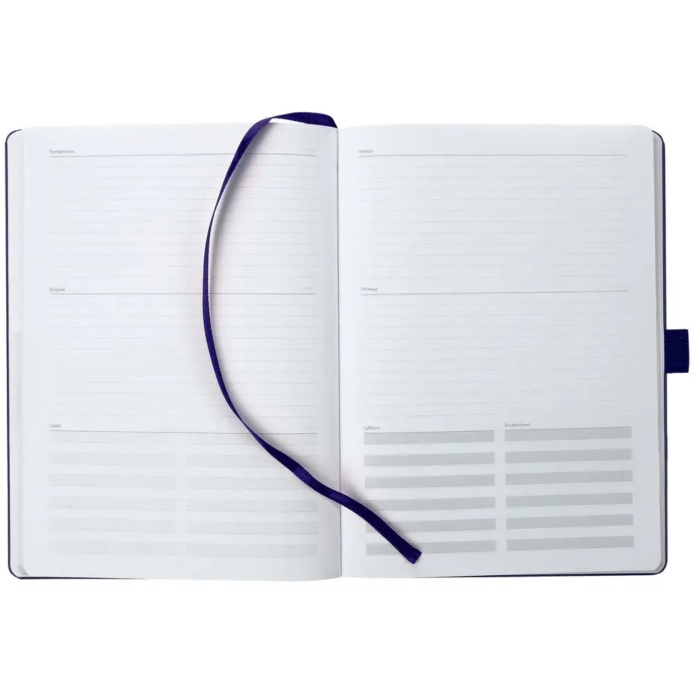 Еженедельник в твердой обложке выполнен из материала Nebraska, синий НН, дополнен резинкой, петлей для ручки и ляссе синего цвета.