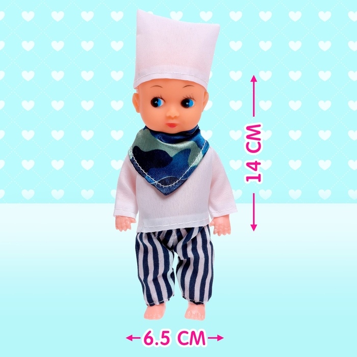 Высота куклы: 14 см. В комплект входит кухонный прибор.