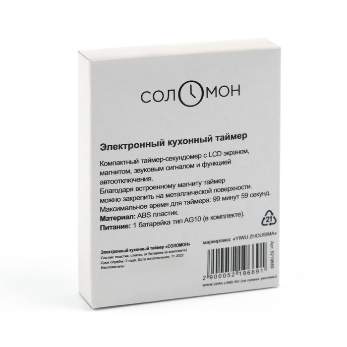 Таймер кухонный на магните "Соломон" - это надежный помощник не только на кухне, но и в быту. Кухонный таймер прекрасно подойдет для самых различных бытовых нужд, кулинарии, приема лекарств, спортивных занятий и в любых других сферах, где нужно отслеживать четкие промежутки времени. По нажатию кнопок M и S устанавливаются минуты и секунды соответственно. Одновременное нажатие этих кнопок приводит к сбросу значений. Кнопка ST/SP служит для запуска и остановки таймера. Таймер кухонный электронный имеет функцию прямого и обратного отсчета. Максимальное время, на которое вы можете поставить отсчет, составляет 99 минут 59 секунд (181 минута). Громкий, но неназойливый звуковой сигнал отключается через 30 секунд или после нажатия на любую клавишу. Таймер снабжен мощным магнитом, его без труда можно установить в удобное для вас место на кухне, например, на дверцу или стенку холодильника, на вытяжку.