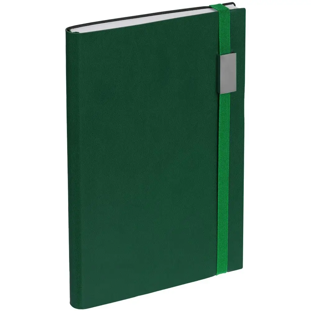 Ежедневник с гибкой обложкой, выполнен из материала Latte, зеленый FF, дополнен резинкой шириной 1 см с металлическим шильдом, капталом и ляссе зеленого цвета.