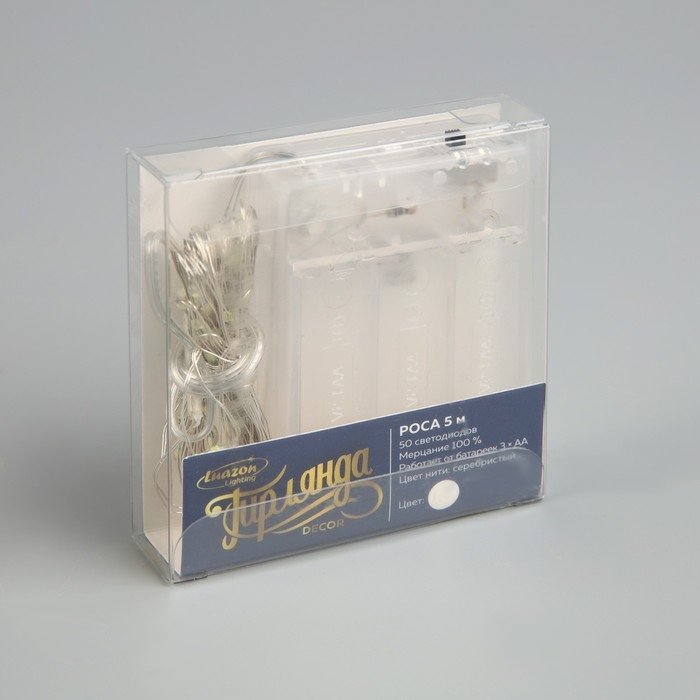 Гирлянда «Нить» 5 м роса, IP20, серебристая нить, 50 LED, мерцание всех светодиодов, батарейки AAх3 (нет в комплекте), свечение белое