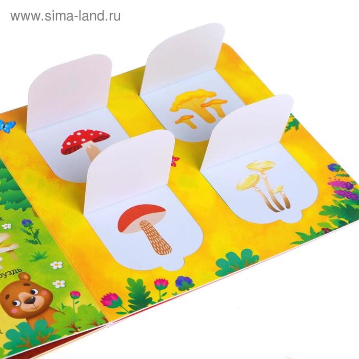 Книга сделана из плотного картона, поэтому прослужит долго. Внутри ребёнок найдёт 16 окошек с яркими изображениями грибов, ягод, животных. Также в книжке есть интересные задания. Между окошками малыш в игровой форме найдёт логическую связь.