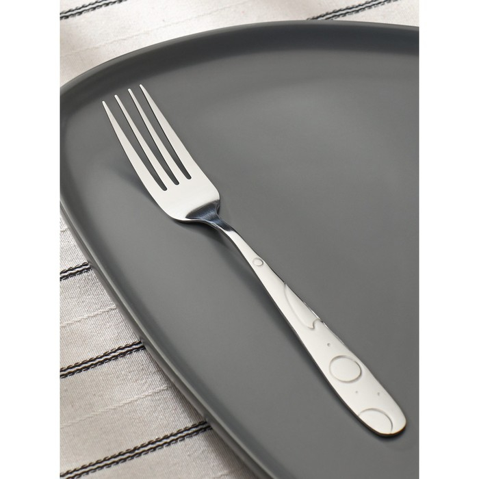 Набор столовых вилок Доляна «Бабл» имеет классический силуэт и четкие контуры. Гладкие отполированные до зеркального блеска ручки приятно держать в руке. Каждый предмет имеет средний вес и размер, на ручках интересный дизайн. Зубья вилок достаточно длинные, чтобы выглядеть элегантно, но при этом они удобны для использования.