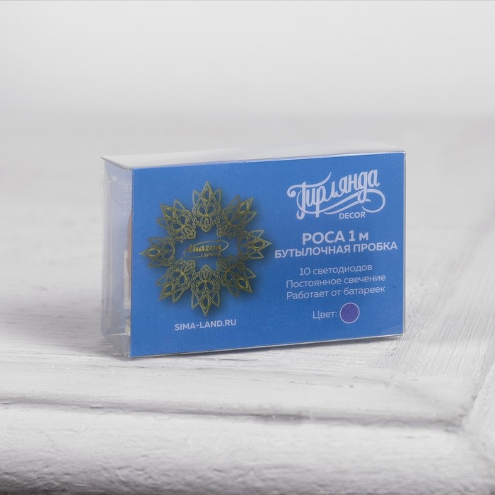 Гирлянда «Нить» 1 м роса с пробкой, IP20, серебристая нить, 10 LED, батарейка LR44х3 (в комплекте), свечение фиолетовое