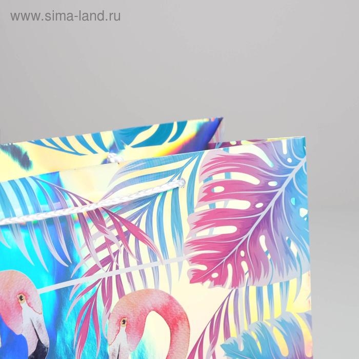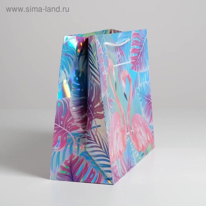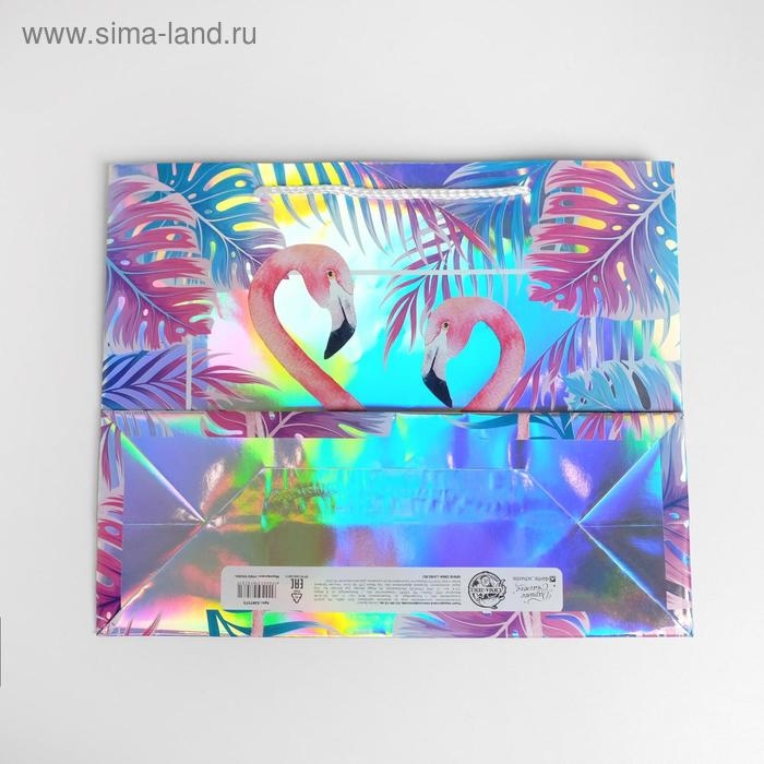 Пакет подарочный голографический, упаковка, «Фламинго», 32 х 26 х 12 см