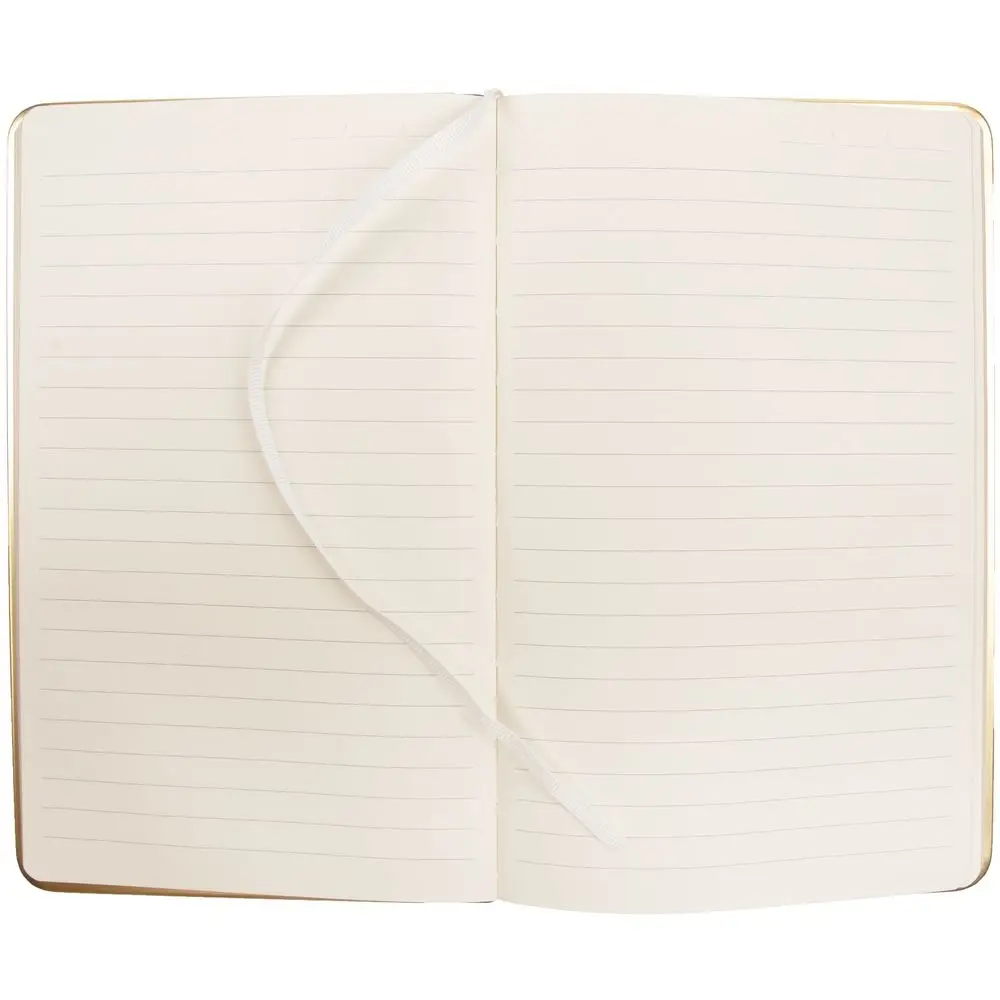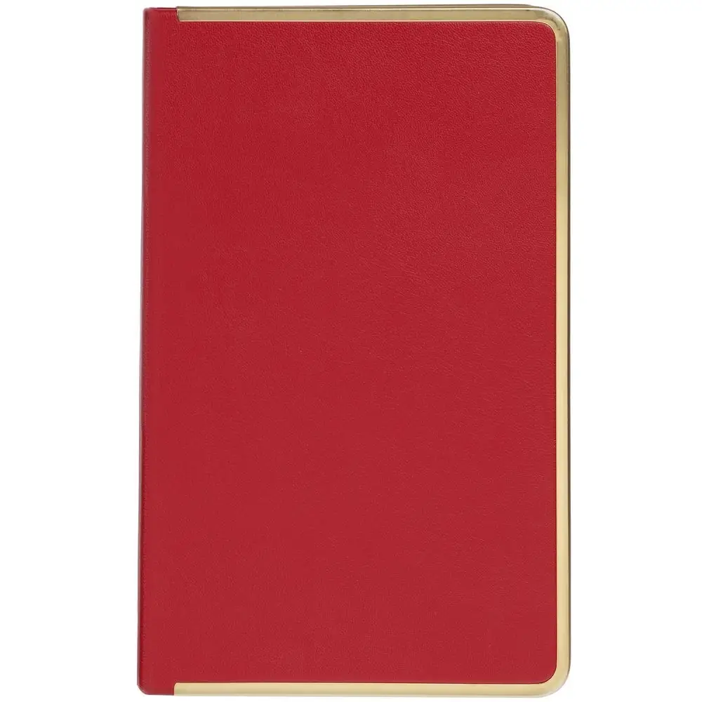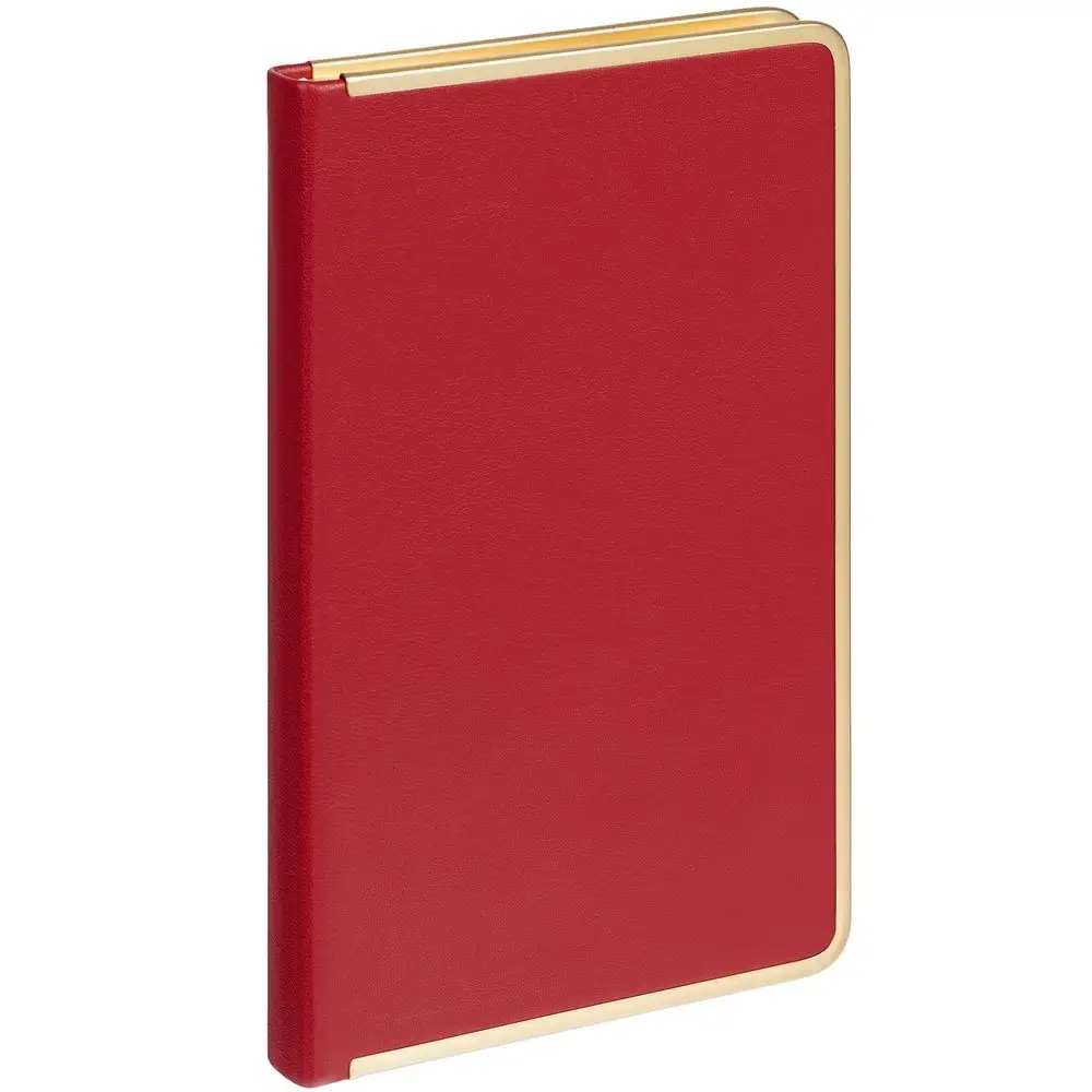 Изящный ежедневник с зауженным блоком и стильными деталями — металлической окантовкой на обложке и металлизированным обрезом.