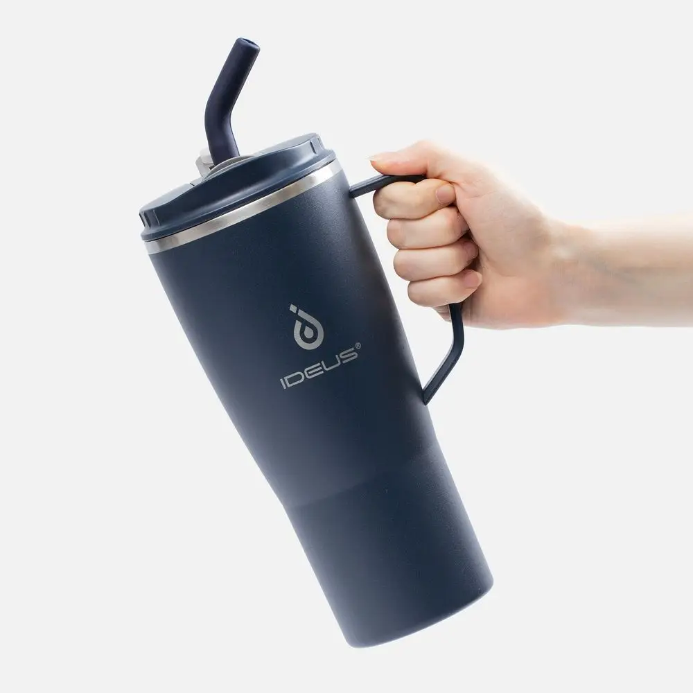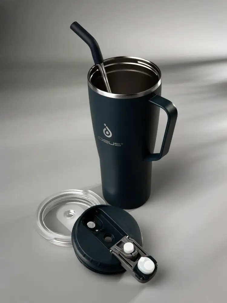 - 2 крышки в комплекте: одна на 100% герметичная с механизмом блокировки отверстия для питья, вторая — с отверстием для трубочки