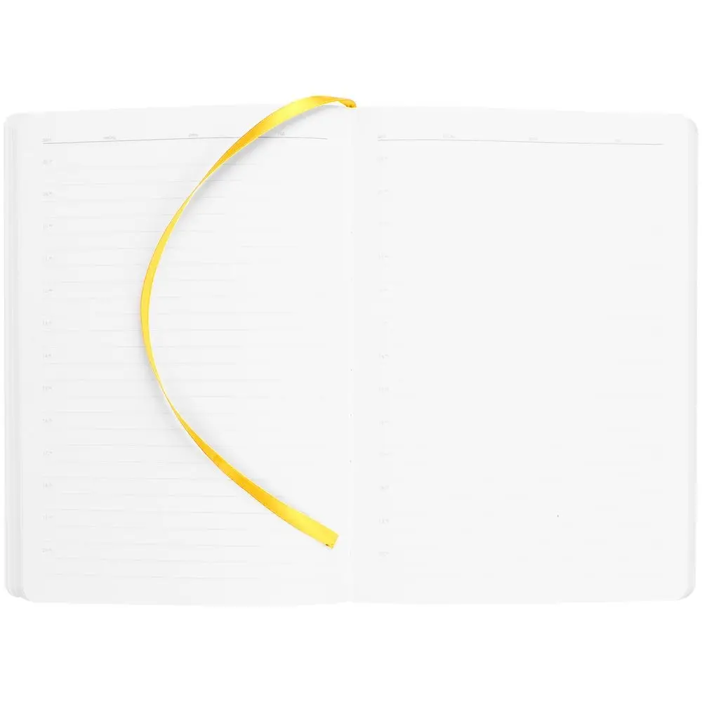 Ежедневник с гибкой обложкой выполнен из материала Soft Touch, желтый KK и Latte, желтый (внутренний материал); дополнен ляссе желтого цвета и фактурным тиснением обложки.