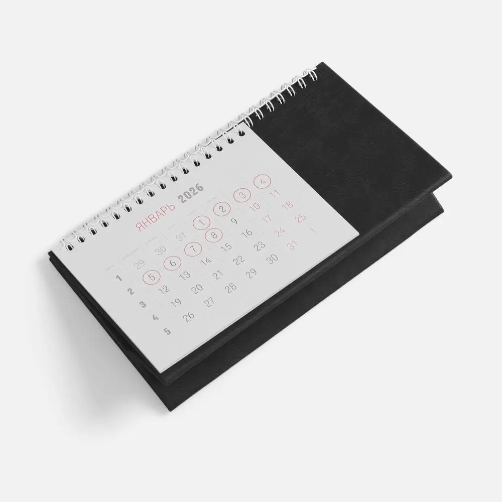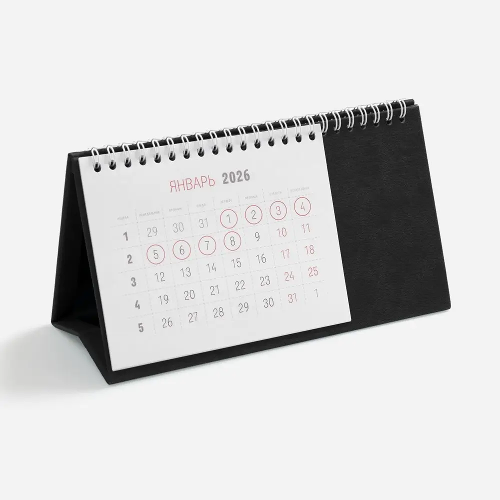 Настольный, перекидной календарь-домик выполнен из материала Latte, черный АА.