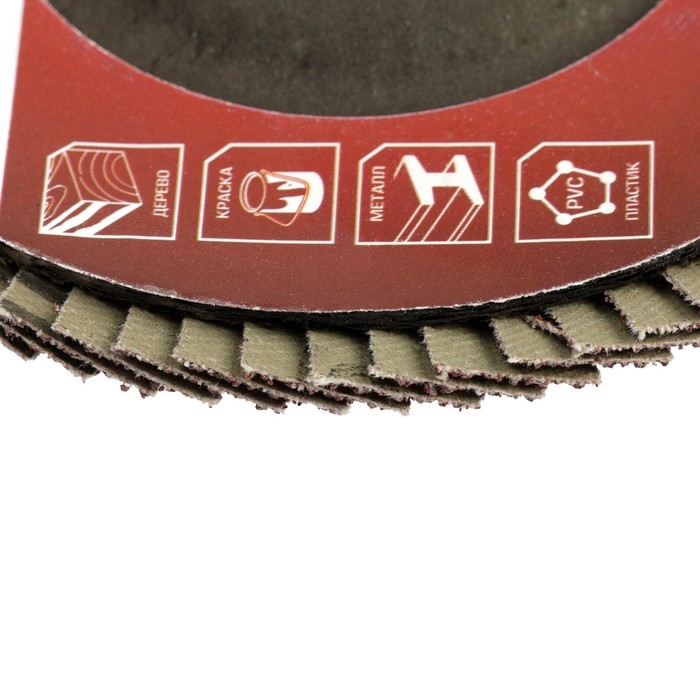 Круг лепестковый торцевой конический ЛОМ изготовлен из прямоугольных элементов шлифовальной шкурки на тканевой основе, которые расположены в виде веера на подложке из стекловолокна.