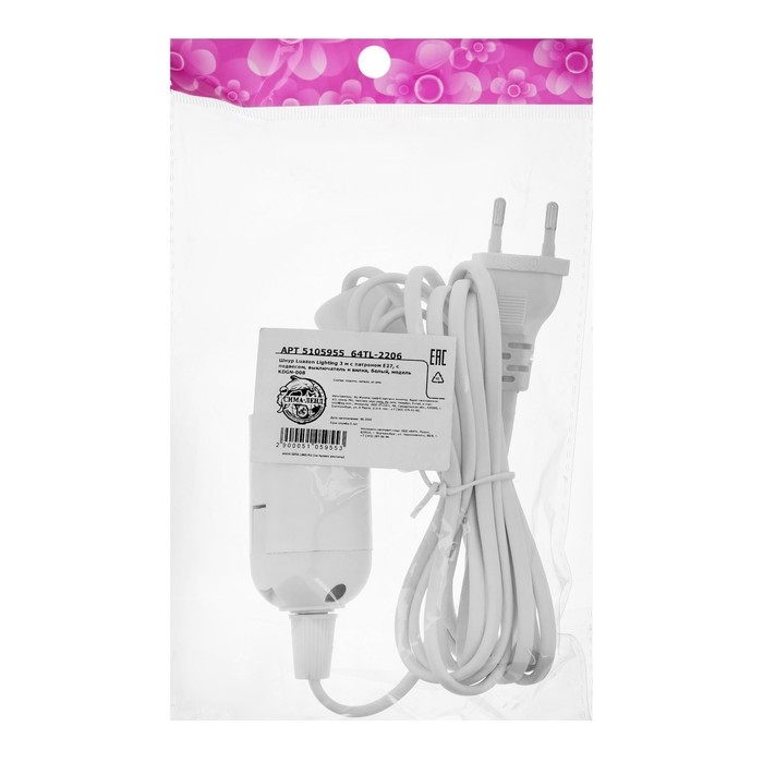 Патрон подвесной с выключателем, Е27, провод 3 м, белый