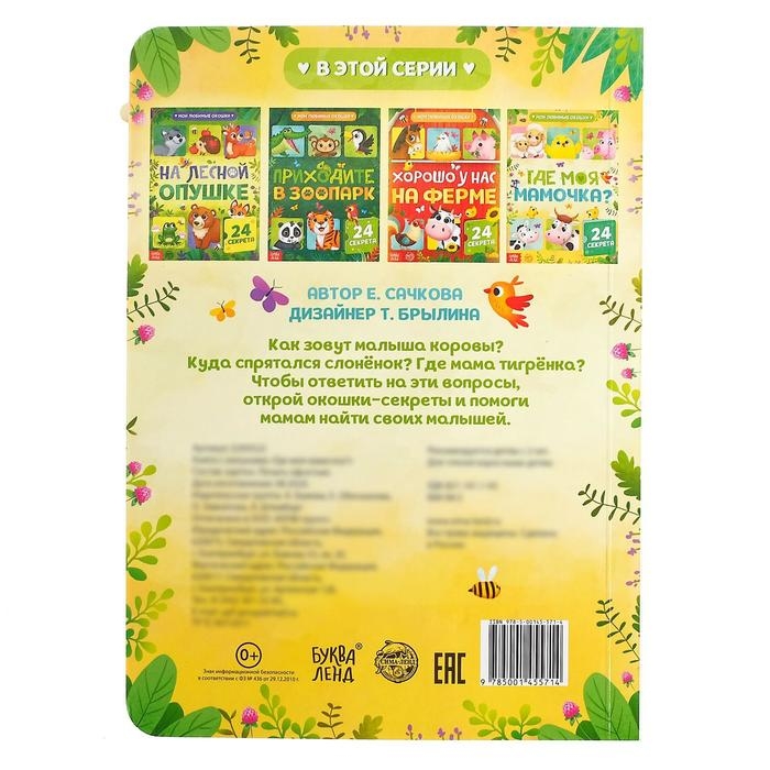 На страницах книги обитают мамы и их детки. А ещё есть много интересных вопросов о животных. Ответить на них очень просто — достаточно посмотреть, кто спрятался в окошке.