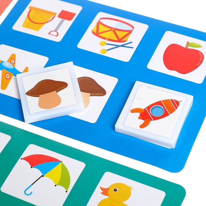 Вырежьте наклейки и приклейте их на пластмассовые фишки. Раздайте каждому игроку карточки. После того как ведущий перемешает все фишки, достаньте их и озвучьте то, что нарисовано на них. Если изображение на игровом поле совпадает с фишкой, то участник забирает её себе. Игрок, накрывший все рисунки на поле, побеждает!