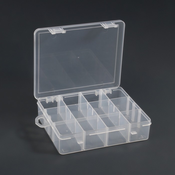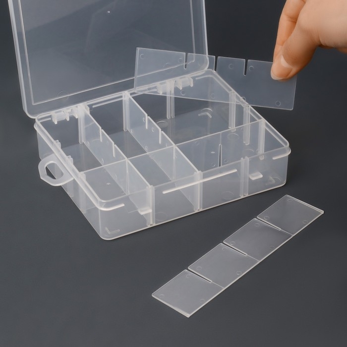 Органайзер выполнен из прозрачного пластика, что обеспечивает удобный обзор содержимого и помогает быстро находить нужные элементы. Прочная крышка защищает содержимое от пыли и повреждений, а передвижные ячейки дают возможность адаптировать пространство под разные нужды — от бисера и страз до небольших инструментов и украшений.