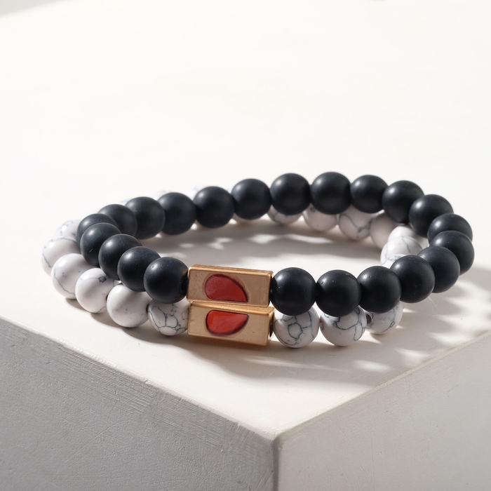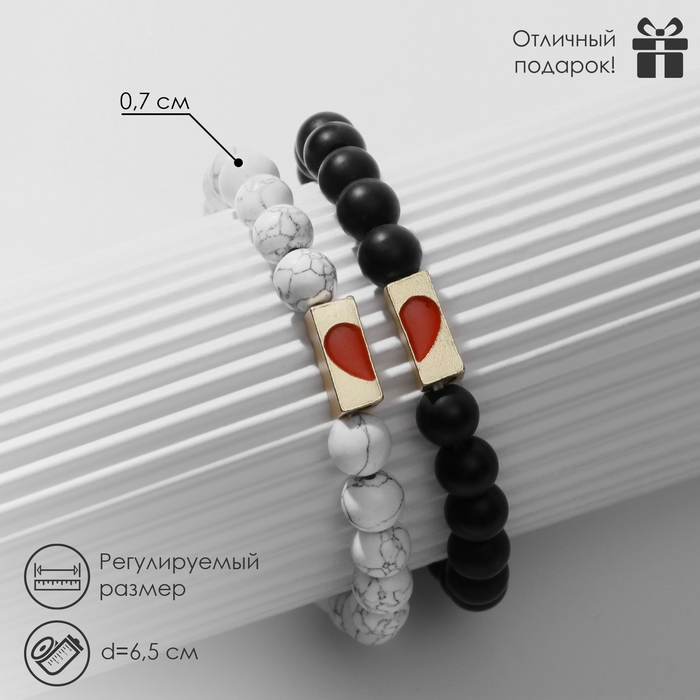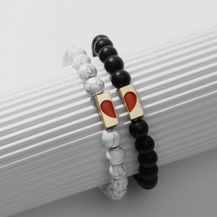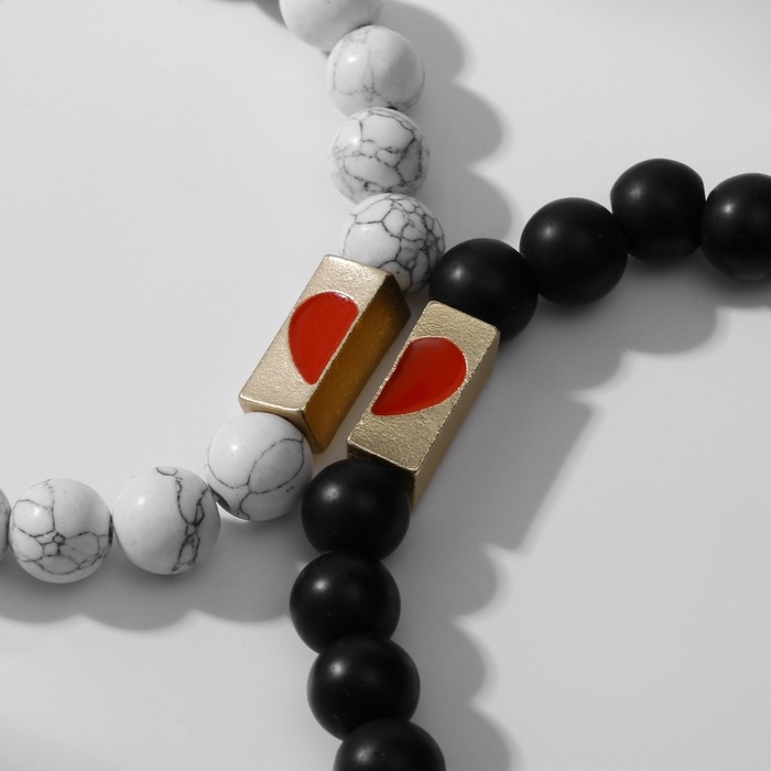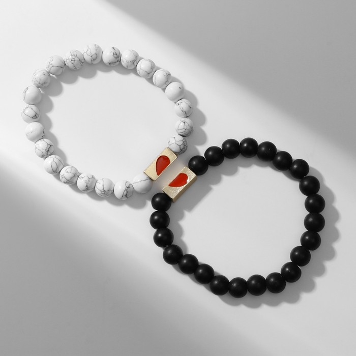 Браслеты «Неразлучники» сердце с бусинами, цвет чёрно-белый, шар №8, d=6,5 см