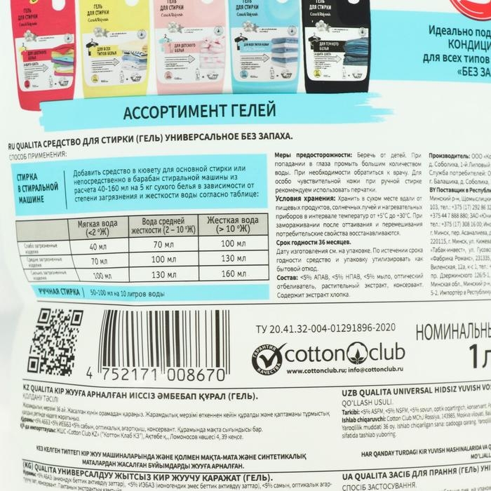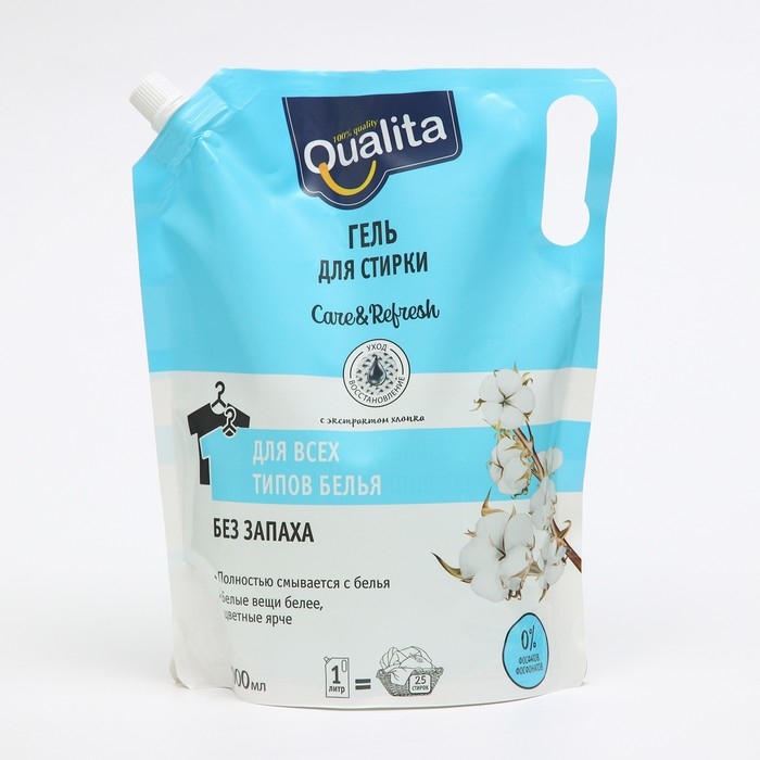 Гель для стирки белья универсальный без запаха Qualita не содержит отдушки, подходит для людей с аллергией на запахи. Стирка в стиральных машинах любых типов и вручную. Концентрированный состав демонстрирует высокую эффективность и экономичный расход. До 90% ингредиентов натурального происхождения, в составе не содержится фосфатов. Гель безопасен для окружающей среды. Экстракт хлопка восстанавливает ткань и защищает от образования катышков. Содержит оптический отбеливатель: белые вещи становятся белее, цветные ярче