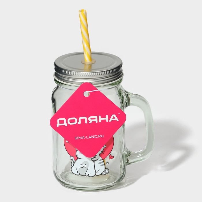 Кружка стеклянная Доляна «Котик», 450 мл, 10×7,5×13 см, с ручкой, крышкой и трубочкой