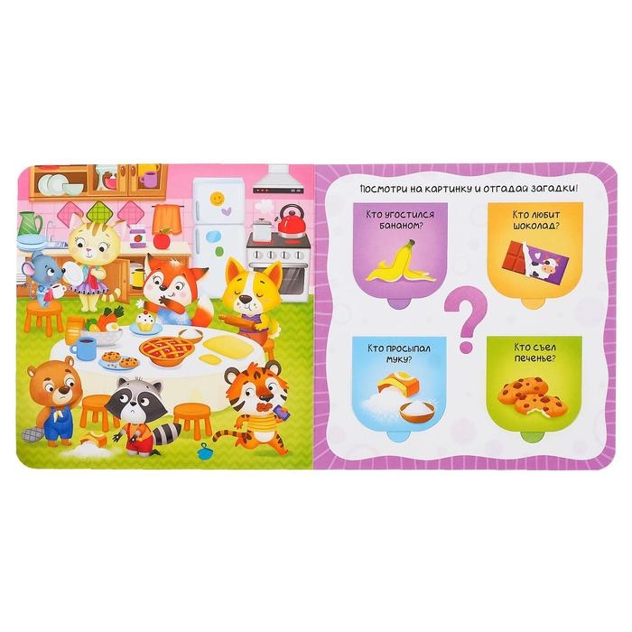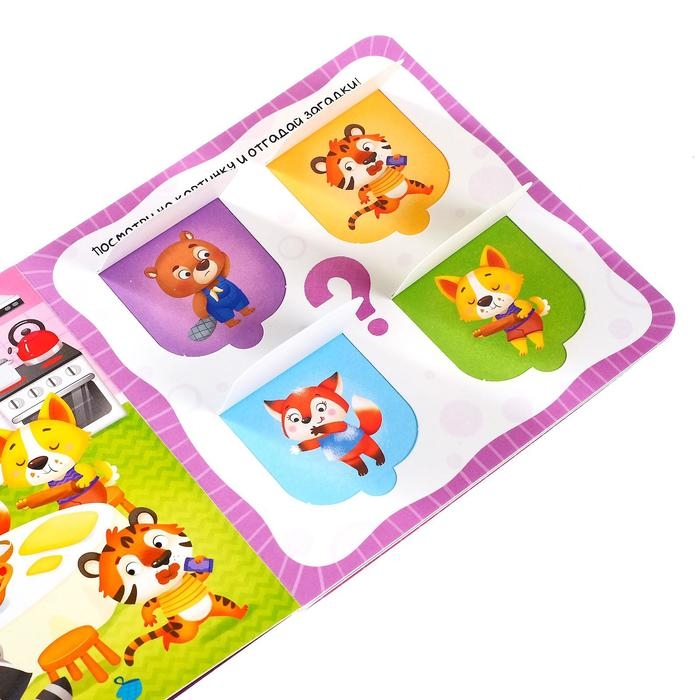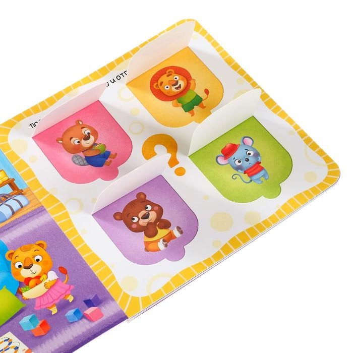 Книга сделана из плотного картона, поэтому прослужит долго. Внутри ребёнок найдёт 16 окошек с яркими изображениями животных и предметов. Также в книжке есть интересные логические загадки.