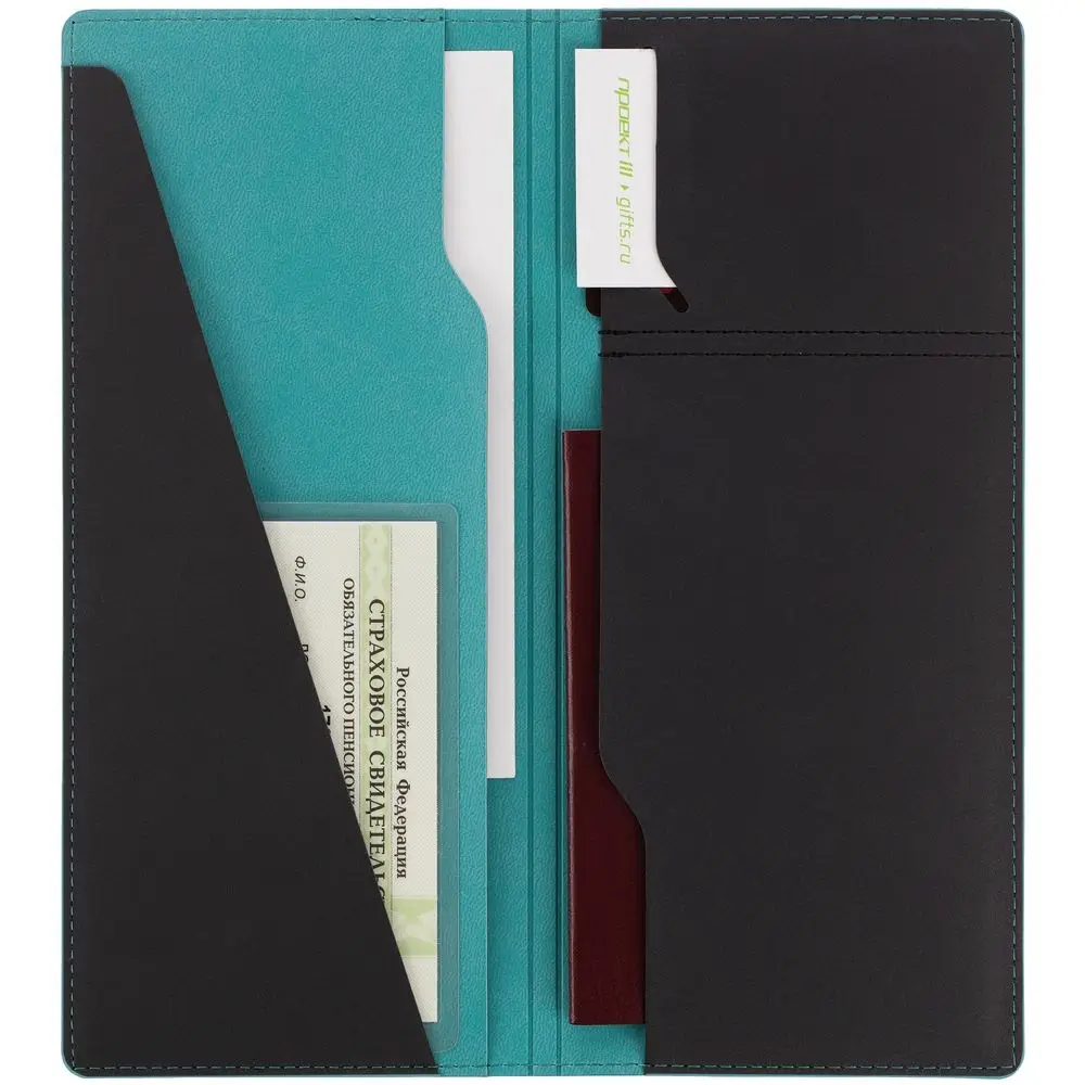 Имеет 5 отделений: для билетов, паспорта, визиток или кредитных карт.