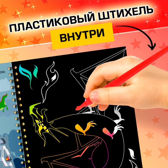 Яркая активити-книга с увлекательными заданиями для девчонок и мальчишек поможет ребёнку скоротать время и провести его с пользой. С помощью пластикового штихеля вы будете стирать специальный слой, за которым скрываются красочные картинки с голографическим фоном! 5 красивых гравюр не дадут заскучать, потренируют мелкую моторику и творческое мышление.