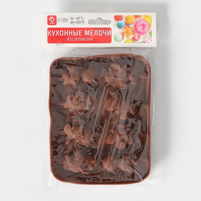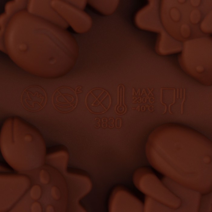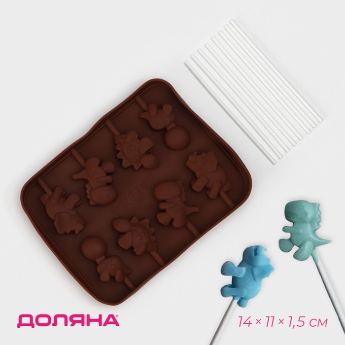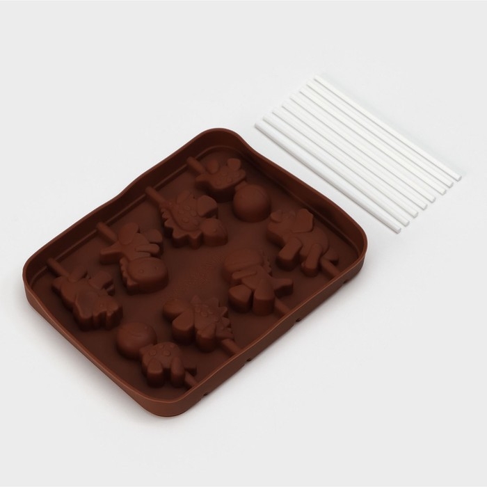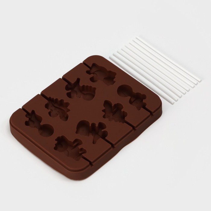 Форма для леденцов Доляна «Дино», силикон, 14×11×1,5 см, 8 ячеек, с палочками, цвет коричневый