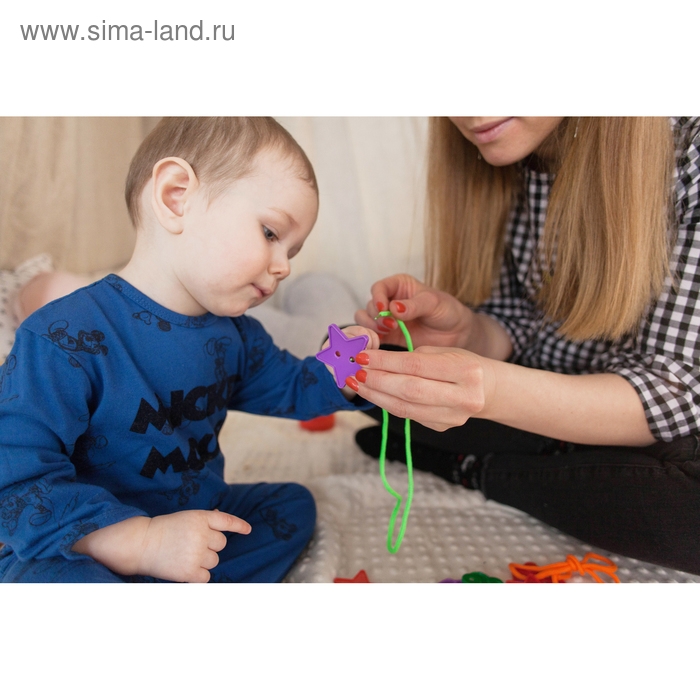Нанизывайте элементы на шнурок в определённой последовательности. Такая игра научит различать цвета и формы предметов.