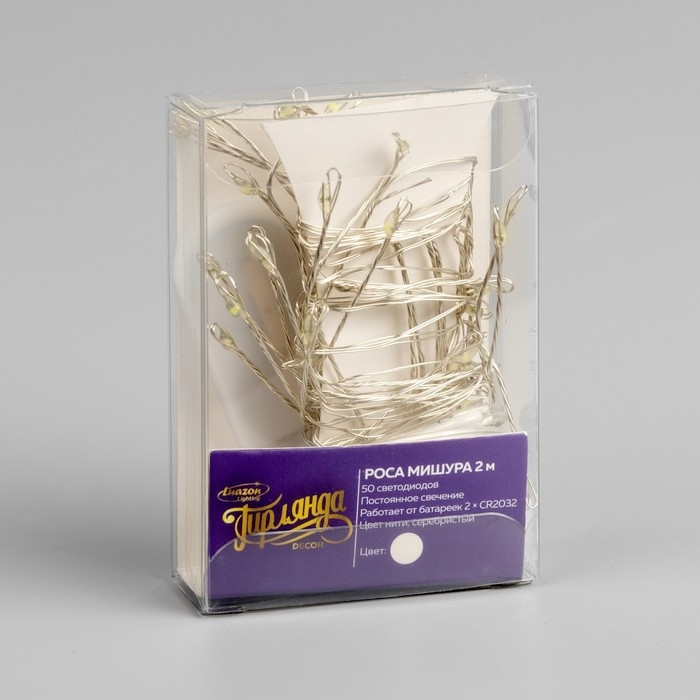 Гирлянда «Мишура» 2 м роса, IP20, серебристая нить, 50 LED, батарейки CR2032х2 (в комплекте), свечение белое