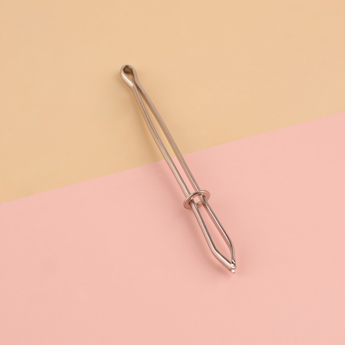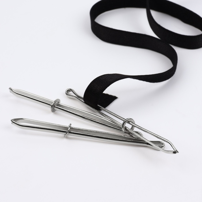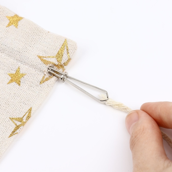 Чтобы продеть в изделие резинку, зажмите её конец между лапками, зафиксируйте их с помощью кольца и проденьте конструкцию в отверстие, через которое будет пролегать подвязка. Приспособление не повредит материал. Также можно использовать для тесьмы или шнура.