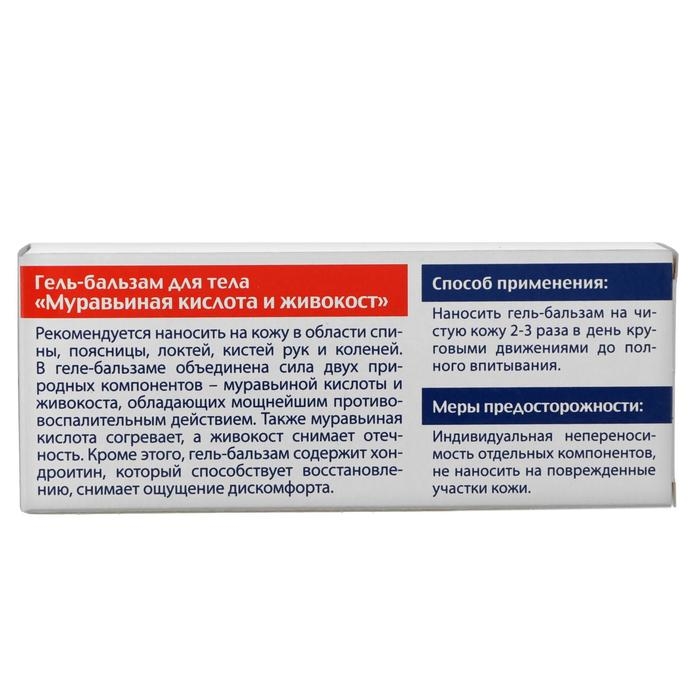 В геле-бальзаме объединена сила двух природных компонентов - муравьиной кислоты и живокоста, обладающих мощнейшим противовоспалительным действием. Также муравьиная кислота согревает, а живокост снимает отечность.