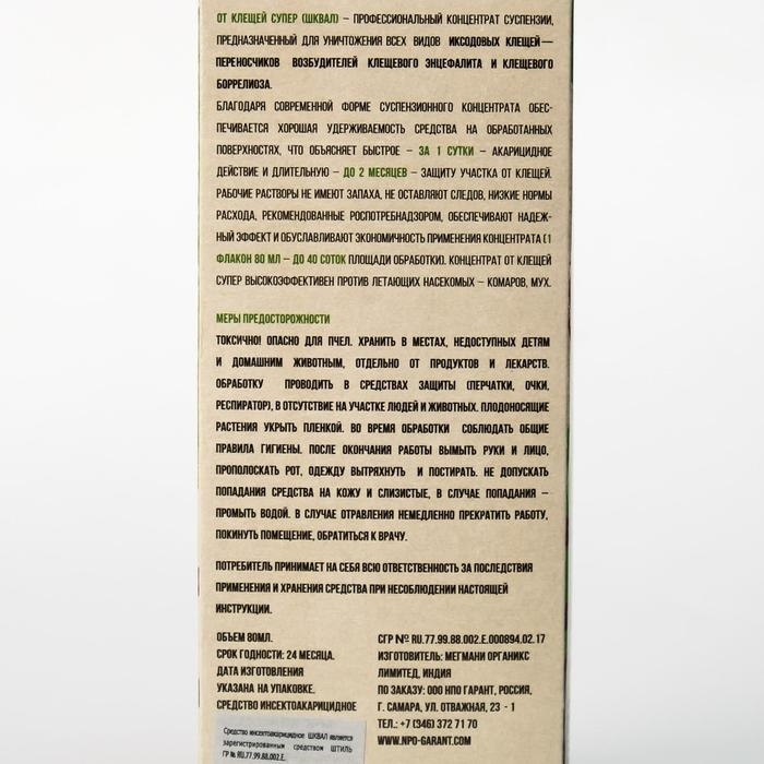 Характеристика: Благодаря современной форме суспензионного концентрата обеспечивается хорошая удерживаемость средства на обработанных поверхностях. Что объясняет быстрое - за 1 сутки - акарицидное действие и длительную - до 2 месяцев - защиту участка от клещей. Рабочие растворы не имеют запаха, не оставляют следов, низкие нормы расхода, рекомендованные Роспотребнадзором, обеспечивают надежный эффект и обуславливают экономичность применения концентрата (1 флакон 80 мл — до 40 соток площади обработки). Концентрат от клещей Супер, высокоэффективен против летающих насекомых - комаров, мух.