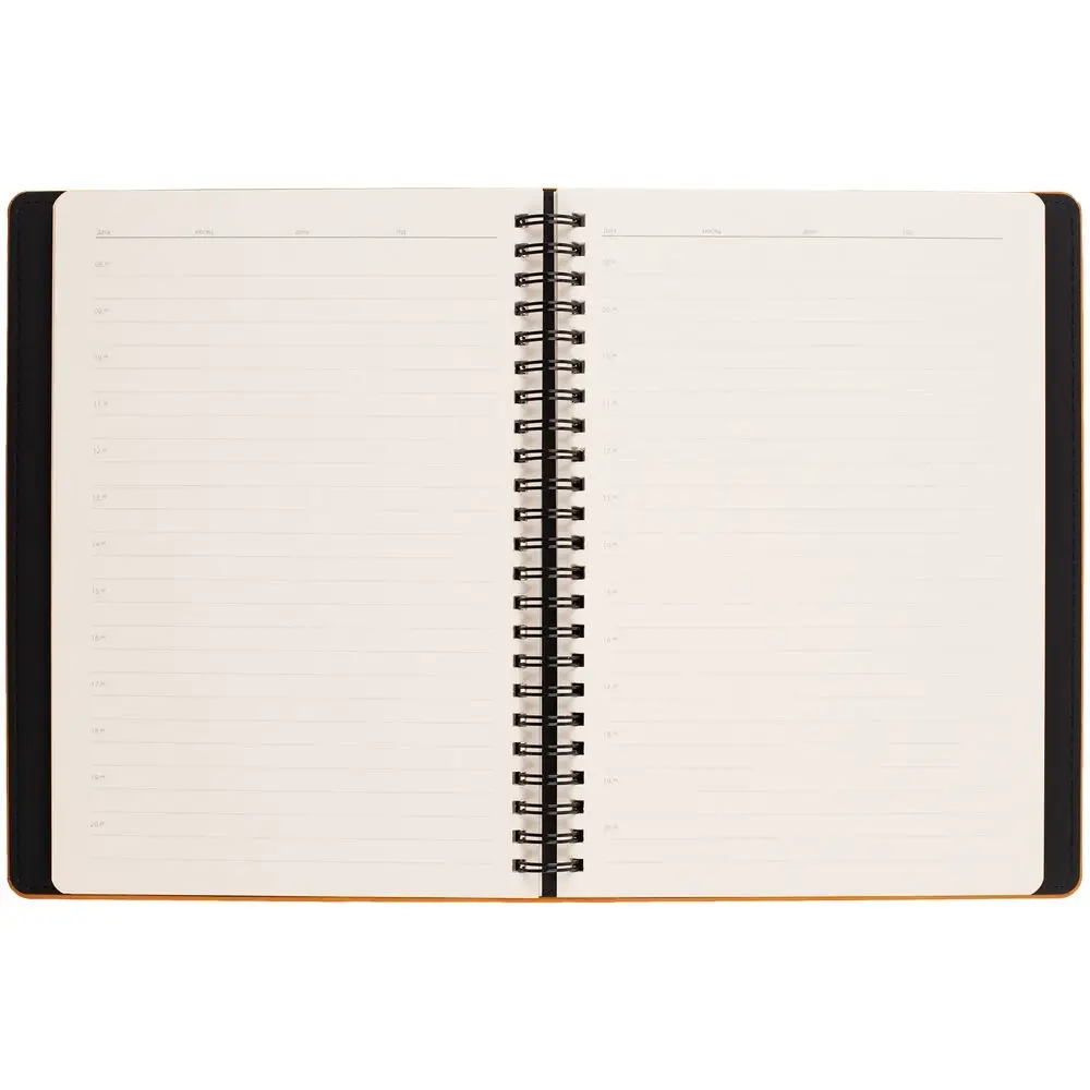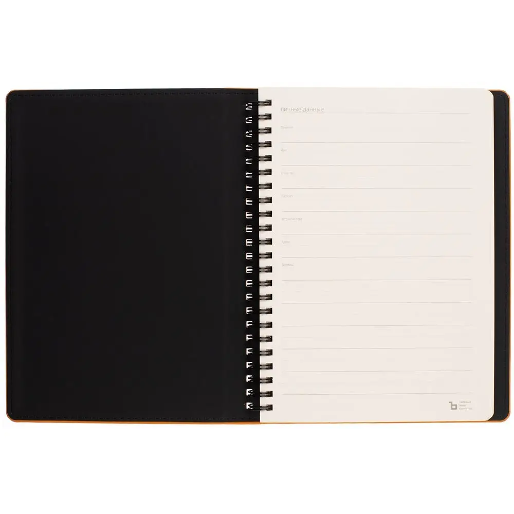 Ежедневник с блоком на пружине в твердой обложке, выполнен из материалов Nubuk Touch, оранжевый ОО и Soft Touch, черный AA.