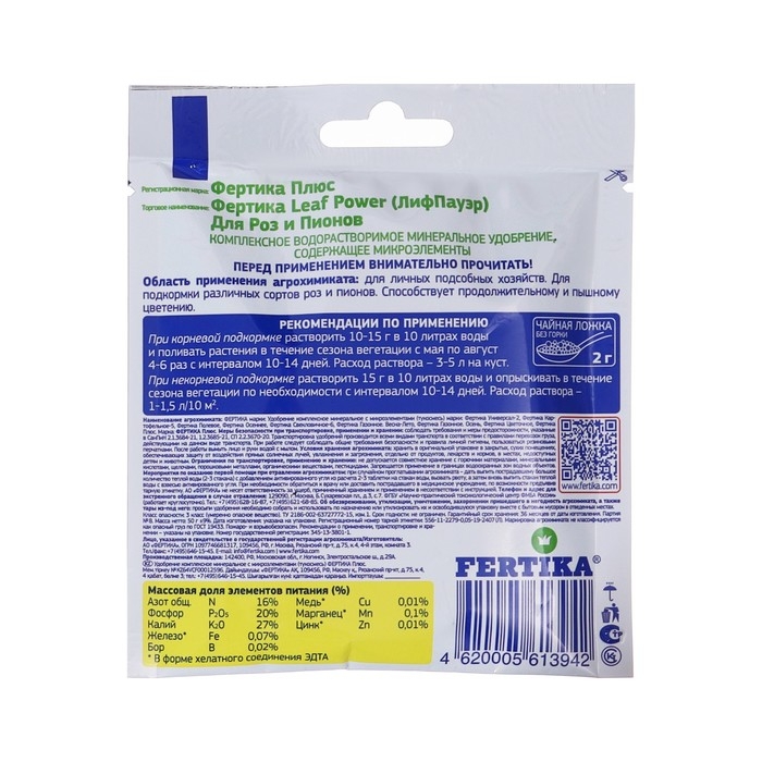Удобрение минеральное "Фертика" "Leaf Power" для роз и пионов, 50 г