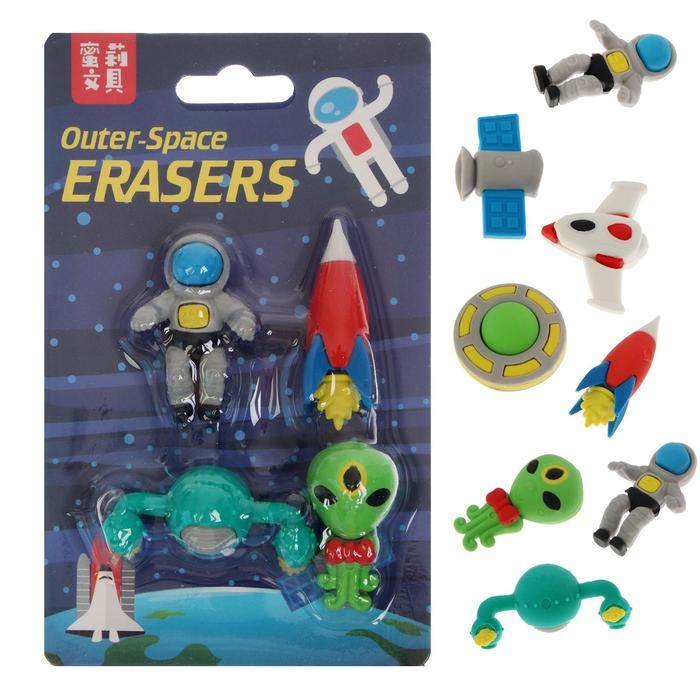 Набор состоит из четырех ластиков в форме космических персонажей. Ластики обеспечат лёгкое и чистое стирание без повреждения поверхности бумаги и без образования бумажной пыли.