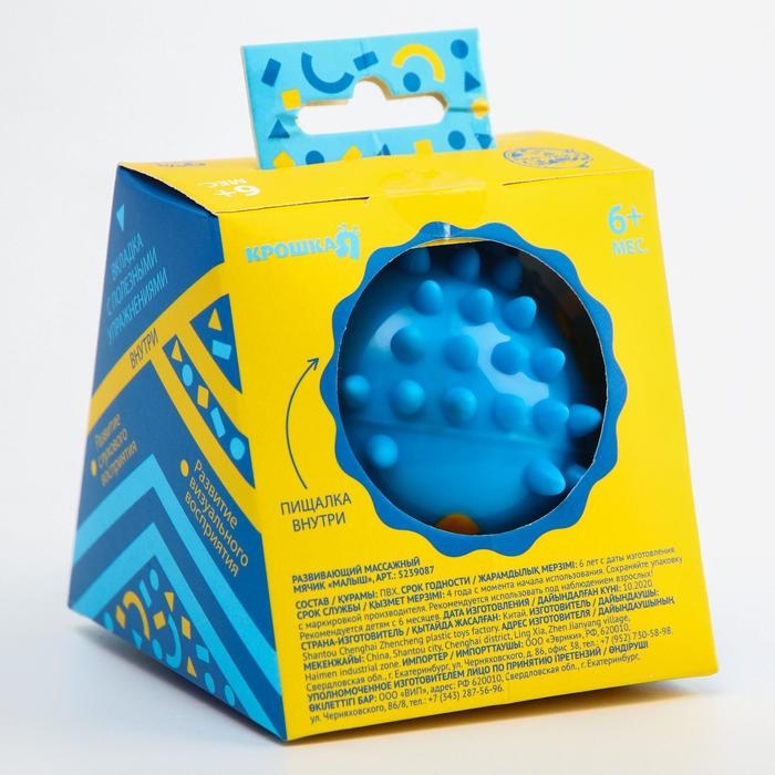 Развивающий тактильный мячик «Малыш»,, с пищалкой, 1 шт, диаметр 9, виды МИКС, Крошка Я
