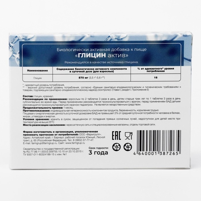 Глицин Актив для взрослых и детей - Биологически активная добавка (БАД) к пище - глицин представляет собой одну из двенадцати аминокислот, которая необходима нашему организму для построения белка.