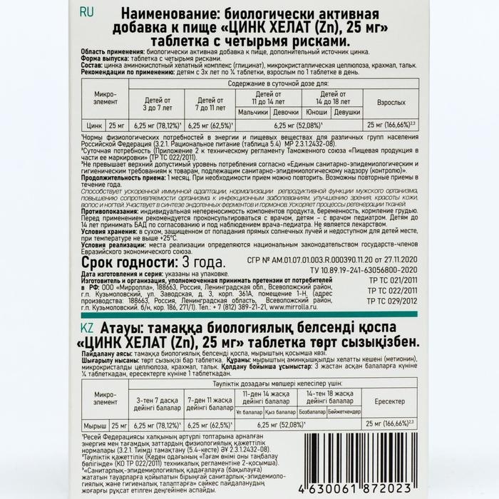 Состав: цинка аминокислотный хелатный комплекс (глицинат), микрокристаллическая целлюлоза, крахмал, тальк.