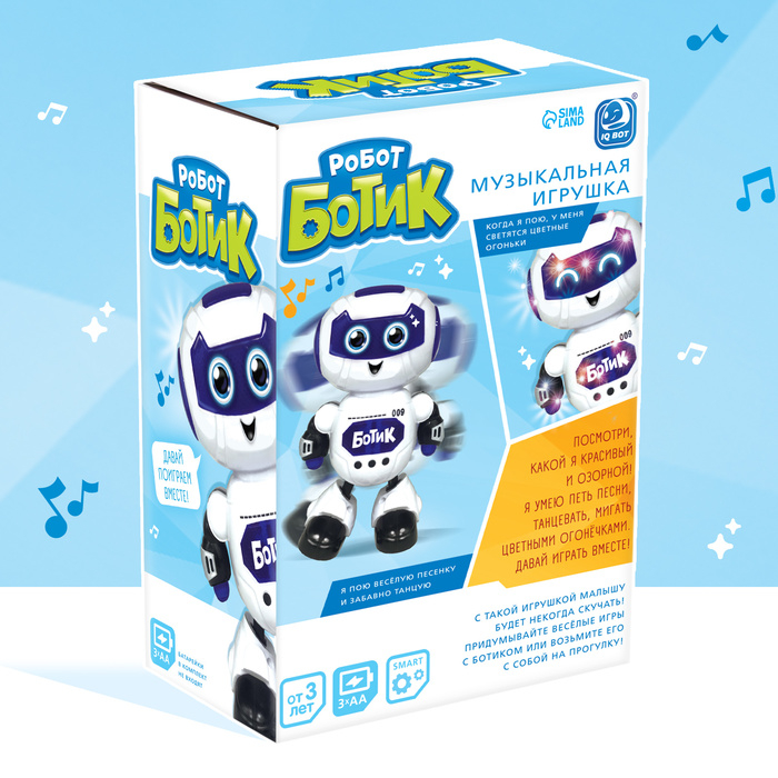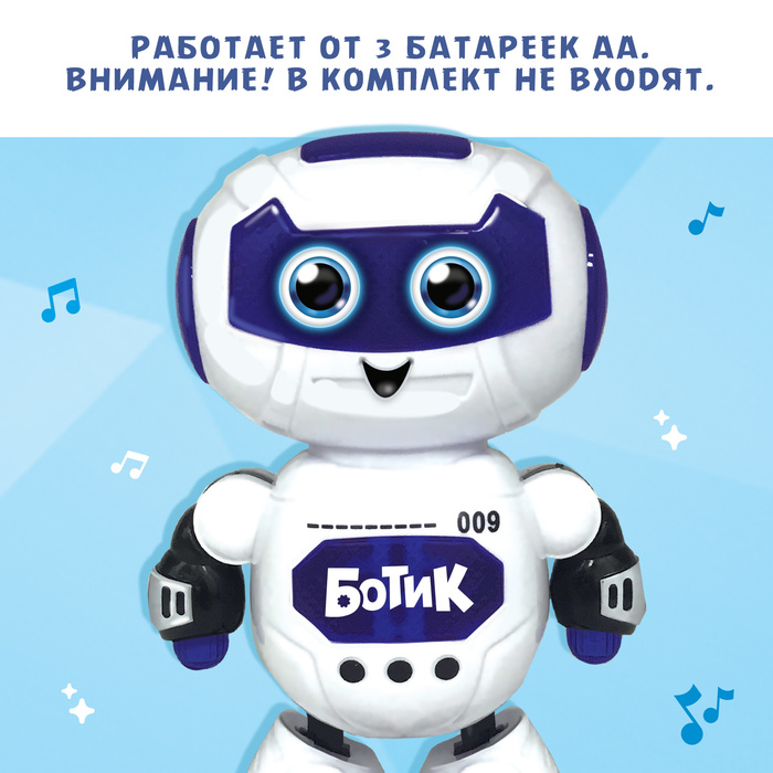 Робот «Ботик» — музыкальная игрушка с яркими световыми эффектами. У мини-бота мигают глаза и лампочки на груди.