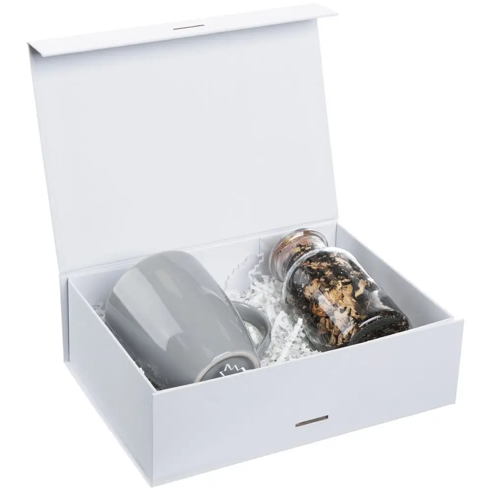 Коробка из переплетного картона, кашированного тонированной в массе крафтовой бумагой. Крышка на двух магнитах дополнительно фиксируется репсовой лентой.Толщина картона 2 мм.