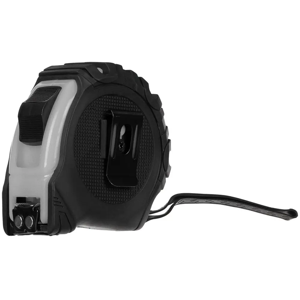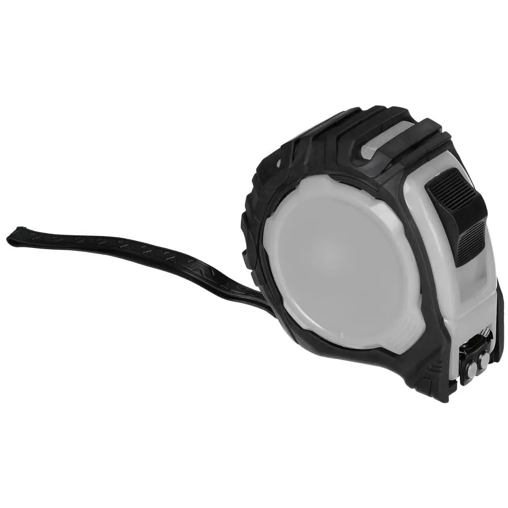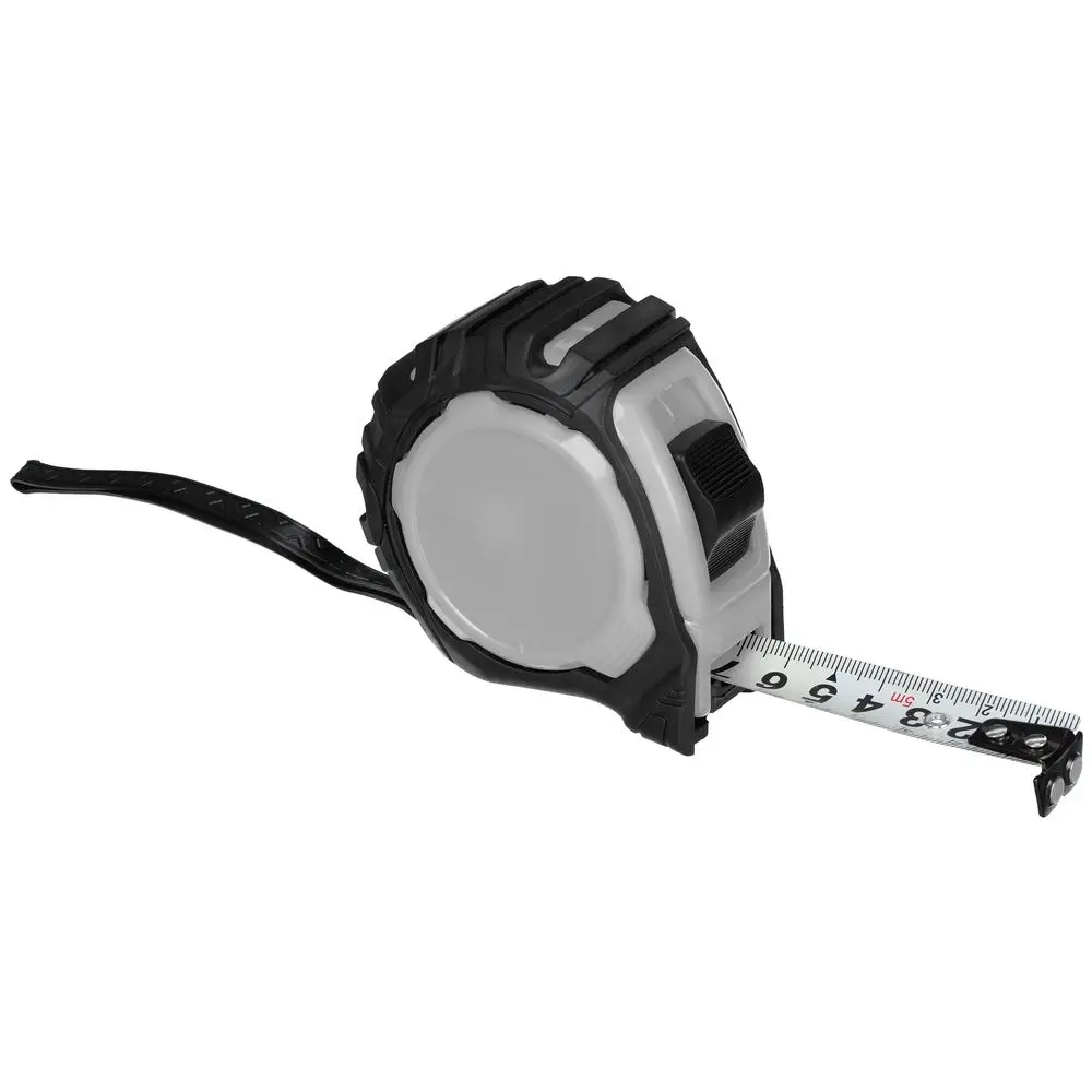 Длина измерительной ленты 5 метров позволяет работать на больших расстояниях. Лента оснащена магнитным наконечником для надежного сцепления с металлическими поверхностями. Корпус рулетки выполнен из прочного пластика с накладкой из ПВХ, которая предотвращает скольжение инструмента в руке.