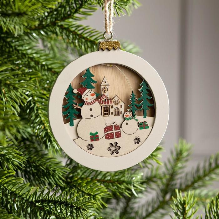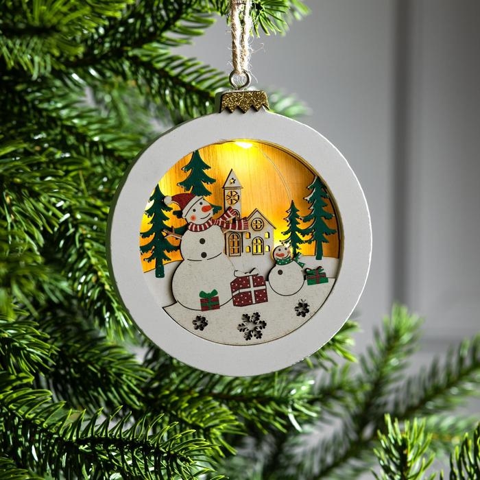Ёлочная игрушка «Шар со снеговиками», от батареек, свечение тёплое белое