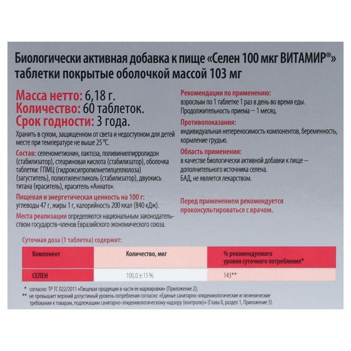 Состав: селенометионин, лактоза, поливинилпирролидон (стабилизатор), стеариновая кислота (стабилизатор), оболочка таблетки: ГПМЦ (гидроксипропилметилцеллюлоза) (загуститель), полиэтиленгликоль 6000 (глазирователь), двуокись титана (краситель), краситель «Аннато».