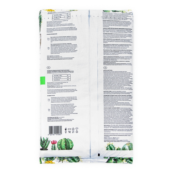 нейтрализатор кислотности. Питательные вещества в форме доступной для растений: азот (NH4 + N03) 90 мг/л; калий (К20) 120 мг/л фосфор (₽205) 150 мг/л. Песок, не менее 10%. Состав торфяного грунта полностью соответствует требованиям, предъявляемым к почве для кактусов - он имеет легкую рыхлую текстуру, хорошо пропускает воду, обогащен минеральными веществами. Субстрат используют для посева семян, укоренения черенков и отпрысков, посадки/пересадки кактусов.